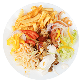 Servie avec salade, tomates, oignons + Frites.