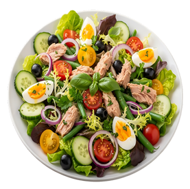 Salade verte, tomates, thon, oeuf, maïs, olives + Pain offert sur demande.