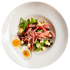 Salade verte, tomates, jambon, emmental, oeuf + Pain offert sur demande.