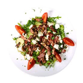 Salade verte, tomates, lardons, chèvre, cornichons + Pain offert sur demande.